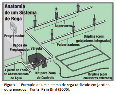 O sistema, de modo simplificado é composto pelo controlador (ou programador), pelas válvulas e pelos emissores (aspersores). A tubulação é dividida em Linha Principal (LP), que vai da fonte da água até as válvulas e as Linhas Secundárias (LS), que vão da válvula até os emissores, conforme demonstra a Figura 1.